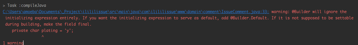 @Builder 는 초기화 표현을 완전히 무시한다. 초기화 하고 싶으면 @Builder.Default 를 사용해. 아니면 final 쓰면돼